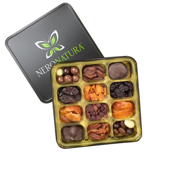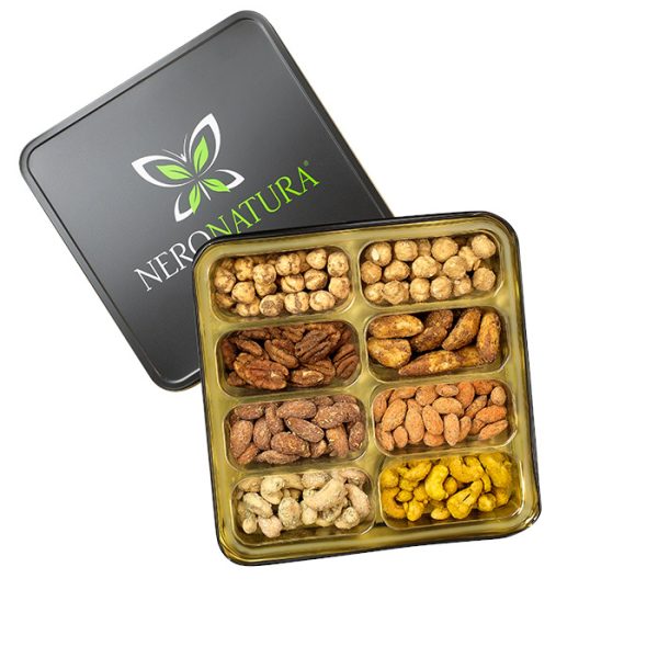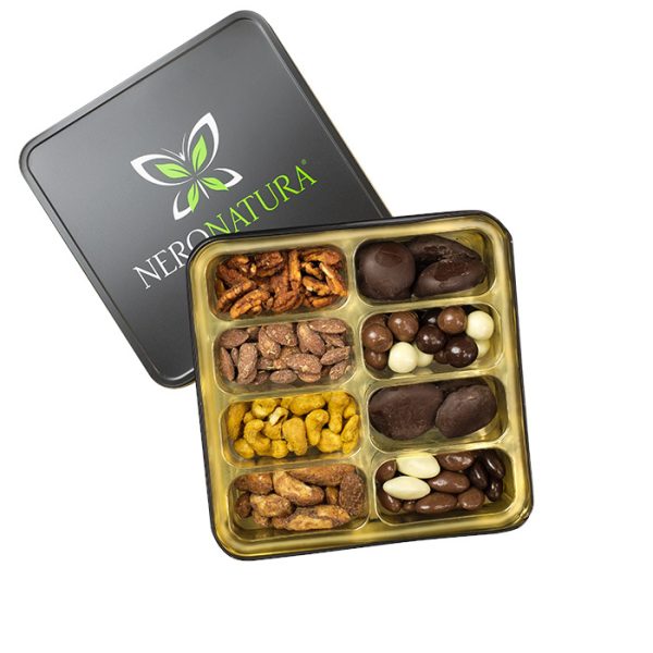 Noci pecan alla paprika affumicata 50g, Fragola ricoperta di cioccolato 70g, Mandorle tostate al rosmarino 70g, Dragèes di nocciola Piemonte IGP (cioccolato al latte/fondente/bianco) 70g, Anacardi tostati al curry 70g, Albicocche ricoperte di cioccolato 80g, Noci Amazzonia al Baharat 70g, Dragèes di mandorle Italia (cioccolato al latte/fondente/bianco) 70g.