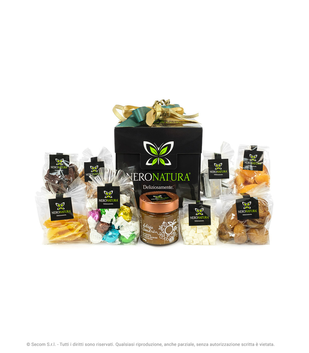 gianduiotti tradizionali, cri cri fondenti, albicocca essiccata in succo di mela, cocco disidratato, fragola essiccata in succo di mela, mango disidratato, mandorle sgusciate, mela cotogna essiccata in succo di mela, composta di frutta.