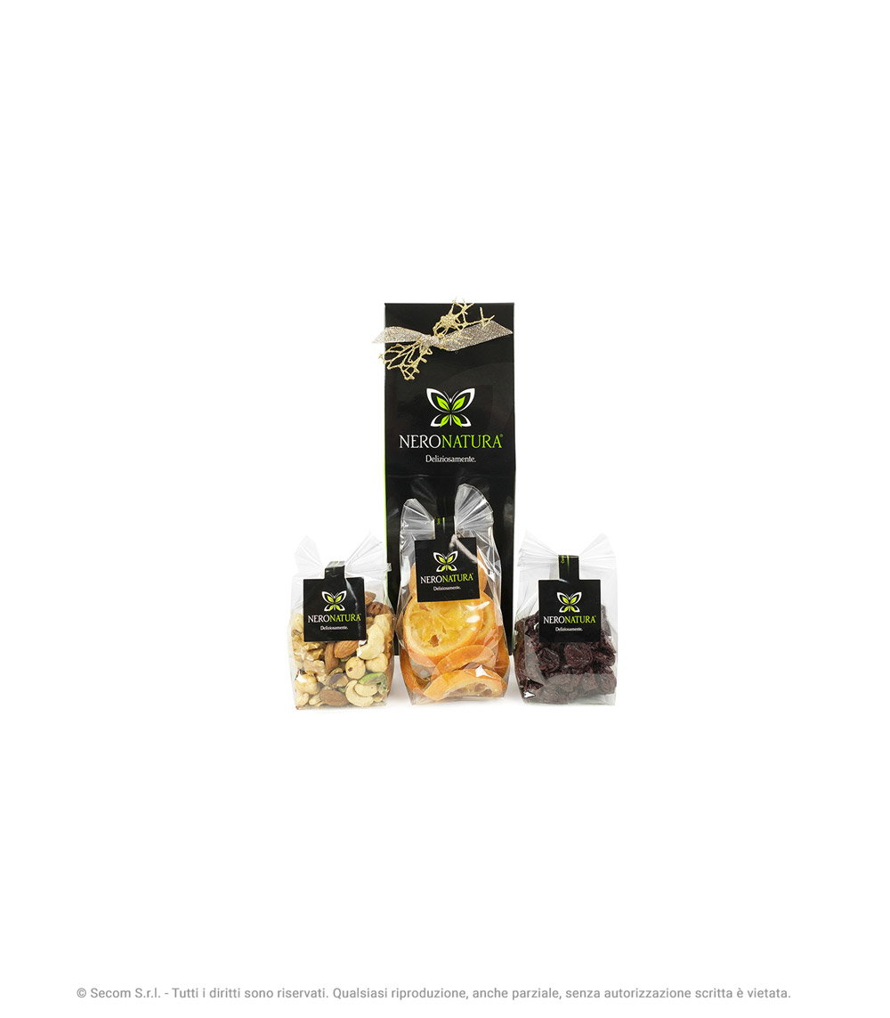 amarena essiccata in succo di mela, arancia disidratata con zucchero di canna, mix frutta secca.