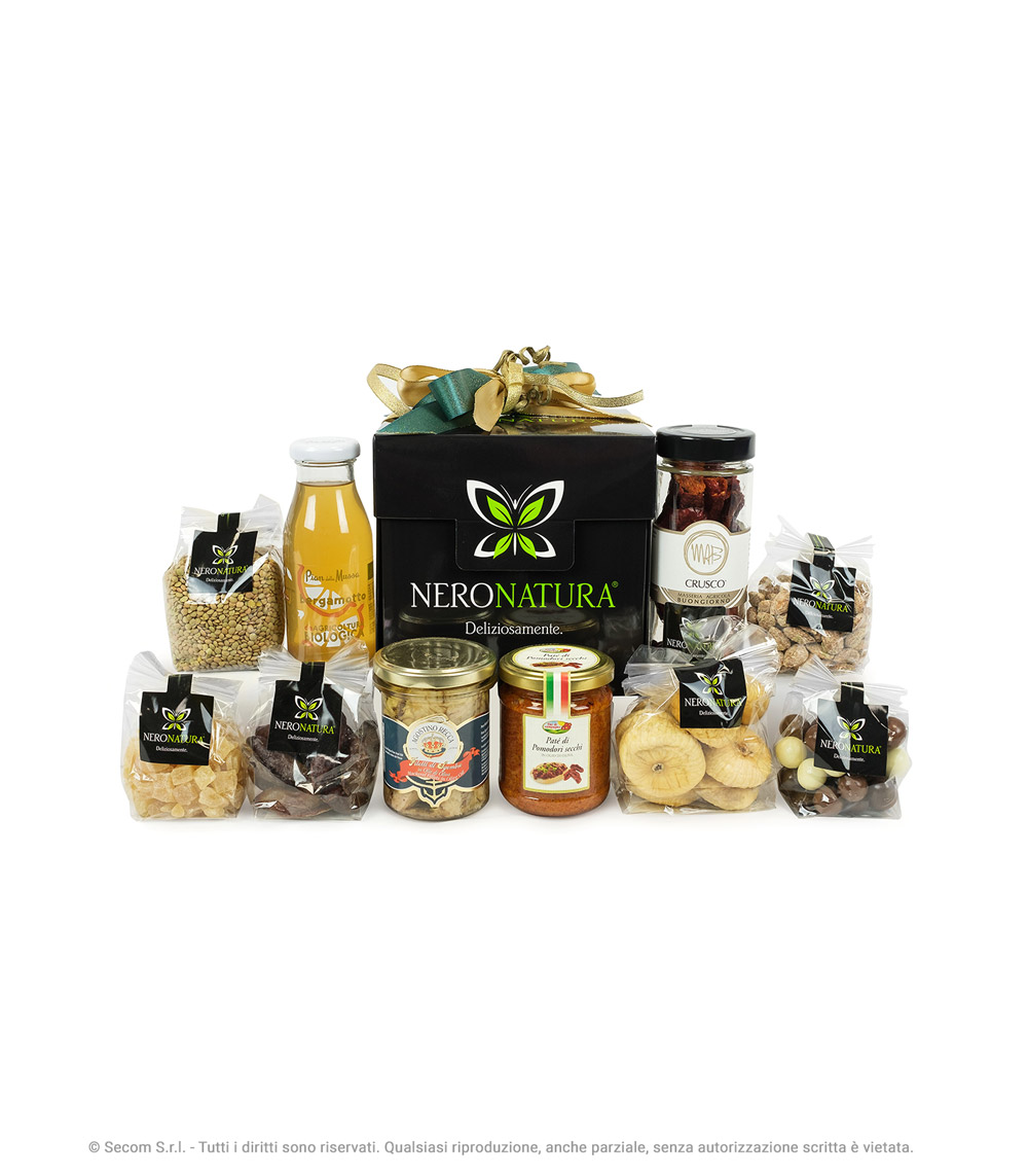 zenzero disidratato a cubetti, patè di pomodori secchi, filetti di sgombro sott’olio, prugna essiccata in succo di mela, succo di frutta bio, peperone crusco fritto di Senise, mandorle tostate al rosmarino, lenticchie italiane, dragees ai 3 cioccolati (latte, fondente, bianco).